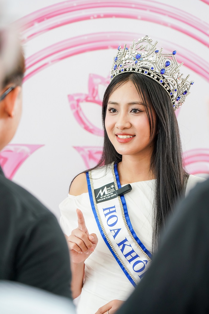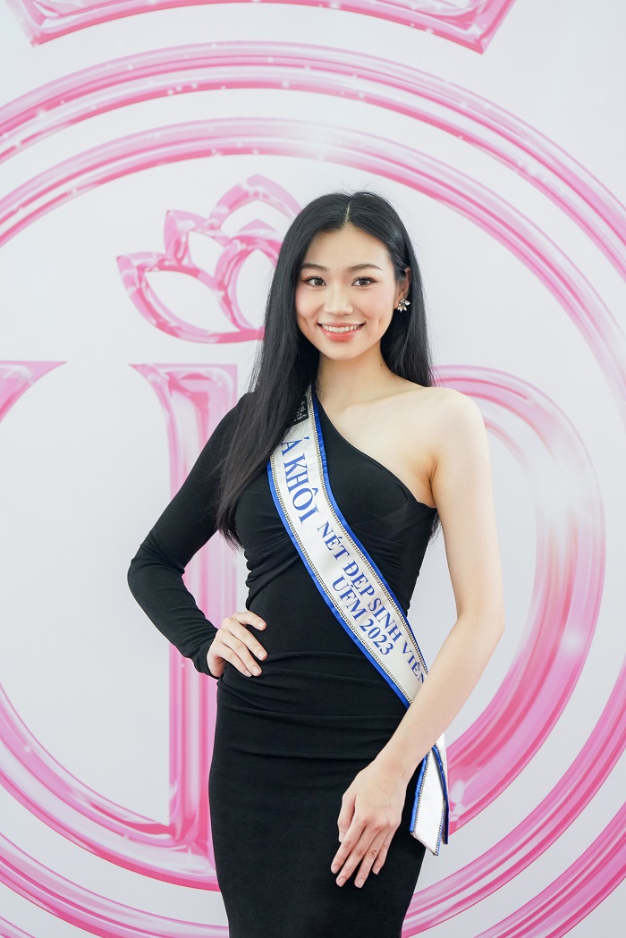 Hoa khôi UFM 2023 Hà Trúc Linh nổi bật tại sự kiện và trả lời phỏng vấn các cơ quan truyền thông, báo chí