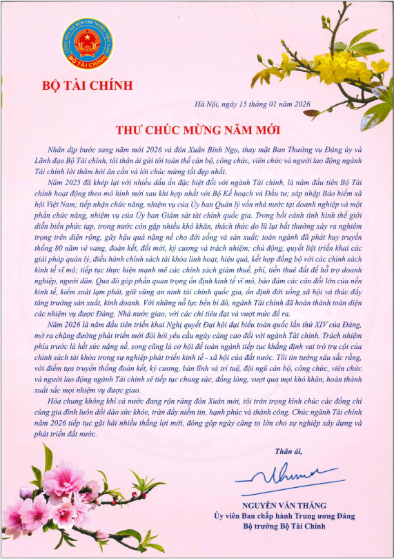 Nhân dịp bước sang năm mới 2026 và đón Xuân Bính Ngọ, Bộ trưởng Bộ Tài chính Nguyễn Văn Thắng có bức thư chúc mừng gửi tới toàn thể cán bộ, công chức, viên chức và người lao động ngành Tài chính.